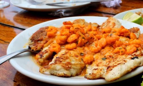 filé de merluza ao molho de camarão, arroz, pirão e fritas