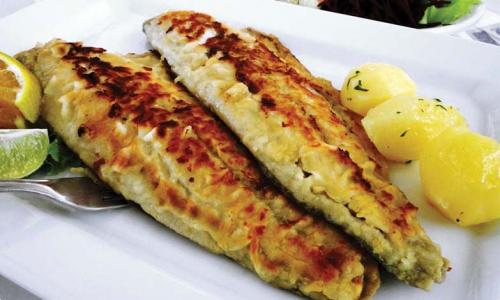 Filé de peixe grelhado c/ alcaparras e champion, arroz, batata sauté ou fritas e pirão