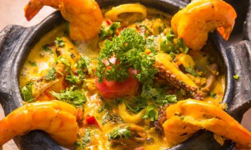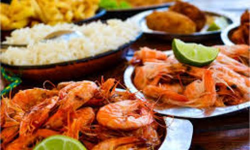 2 casquinhas de siri, camarão ao alho e óleo, camarão à milanesa, camarão ao bafo, peixe ao molho de camaão, arroz, fritas e pirão