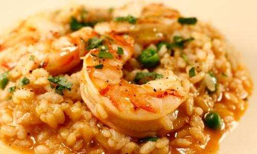 Risoto com marisco, camarão, lula, peixe e fritas